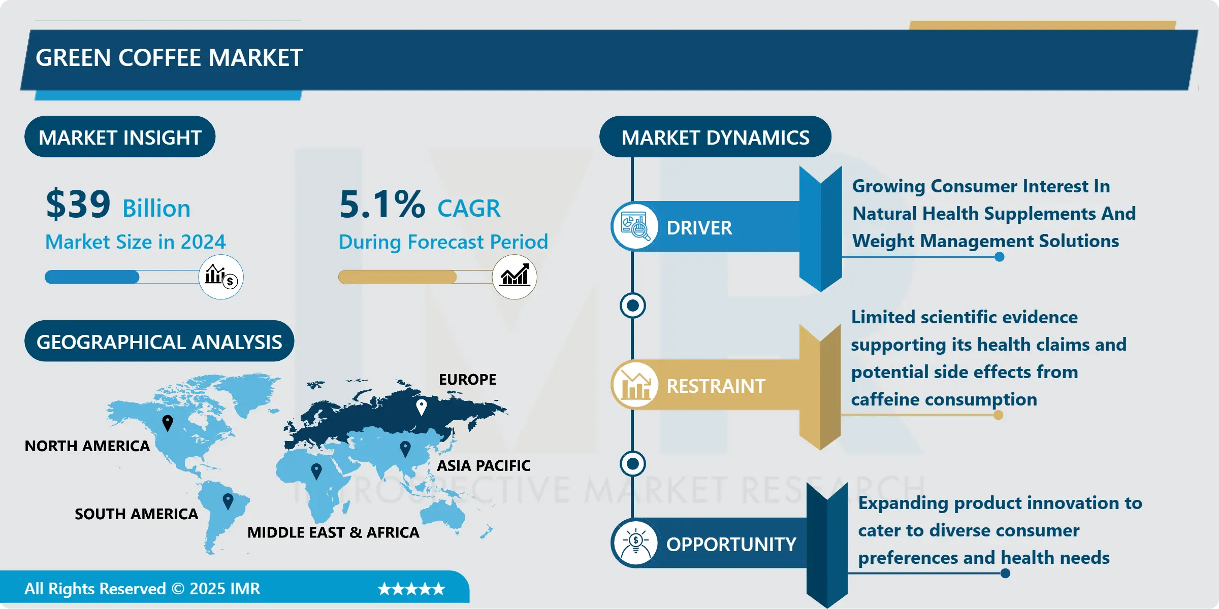 Green Coffee Market Size Was Valued at USD 39 Billion in 2024, and is Projected to Reach USD 58.07 Billion by 2032, Growing at a CAGR of 5.1% From 2025-2032.