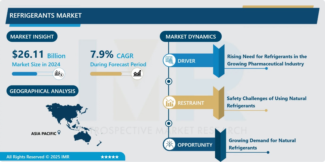 - The Refrigerants market is a sector of the global economy that produces and distributes refrigerants, which are substances used to cool and preserve food and other items. Refrigerants are used in a variety of applications, including air conditioning, refrigeration, and industrial cooling.