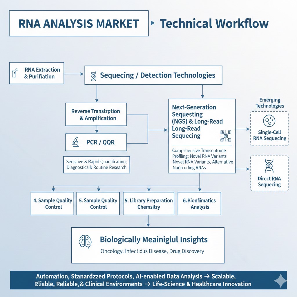 The RNA Analysis market is technically driven by advanced workflows that enable accurate measurement of gene expression, transcript structure, and RNA modifications. At the core of these workflows are RNA extraction and purification systems, followed by reverse transcription, amplification, and sequencing or detection technologies.