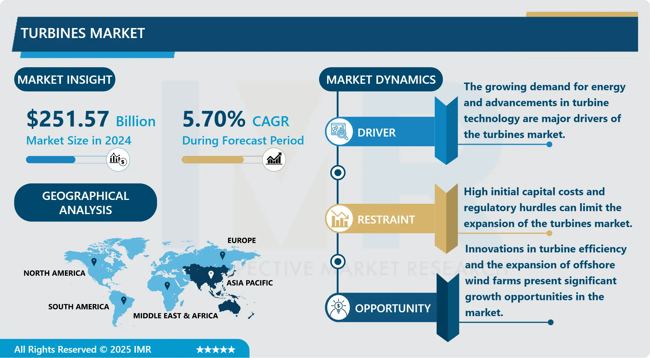The turbine market is a critical segment of the global energy sector that encompasses a variety of turbines used for power generation, such as gas, steam, and wind turbines. The global transition to renewable energy sources and the growing demand for energy across a variety of industries.